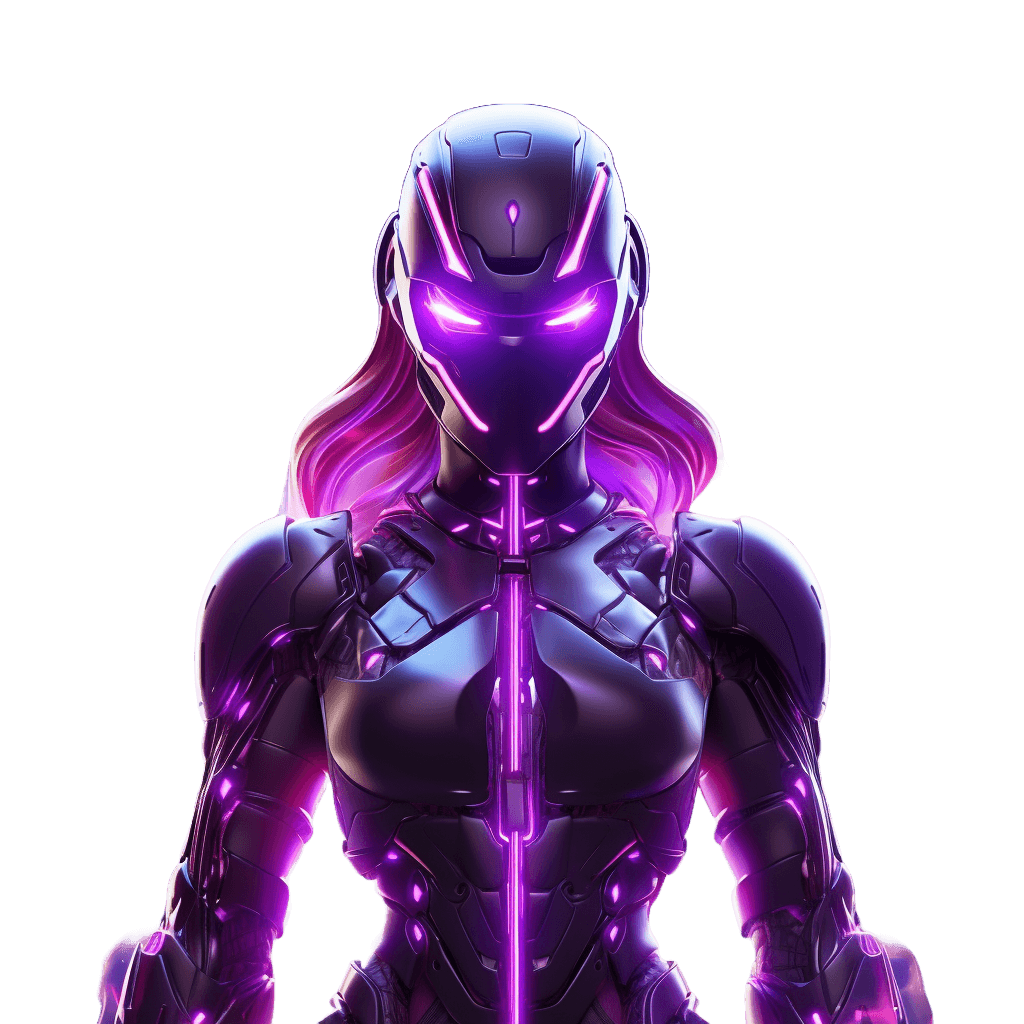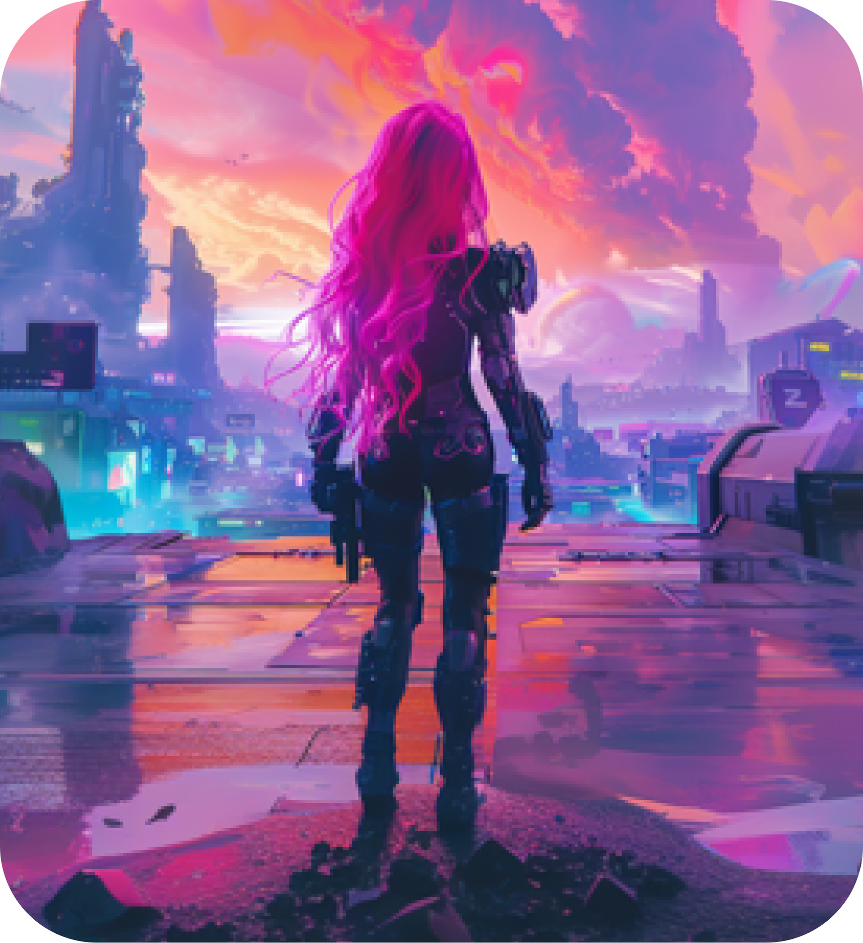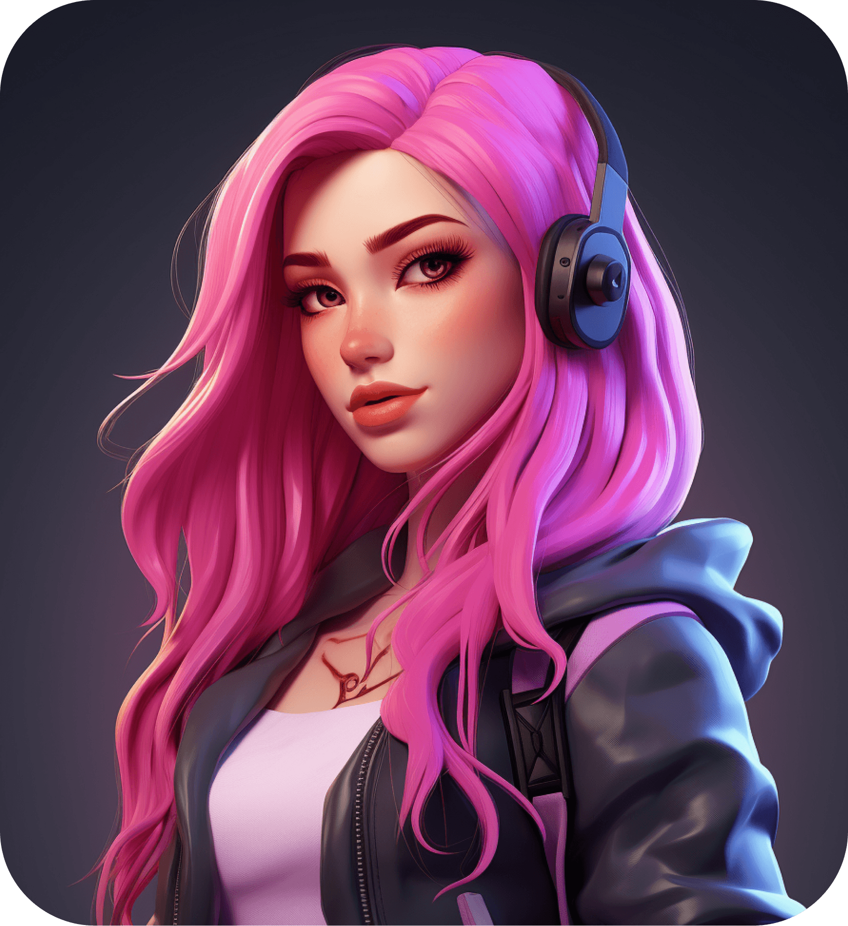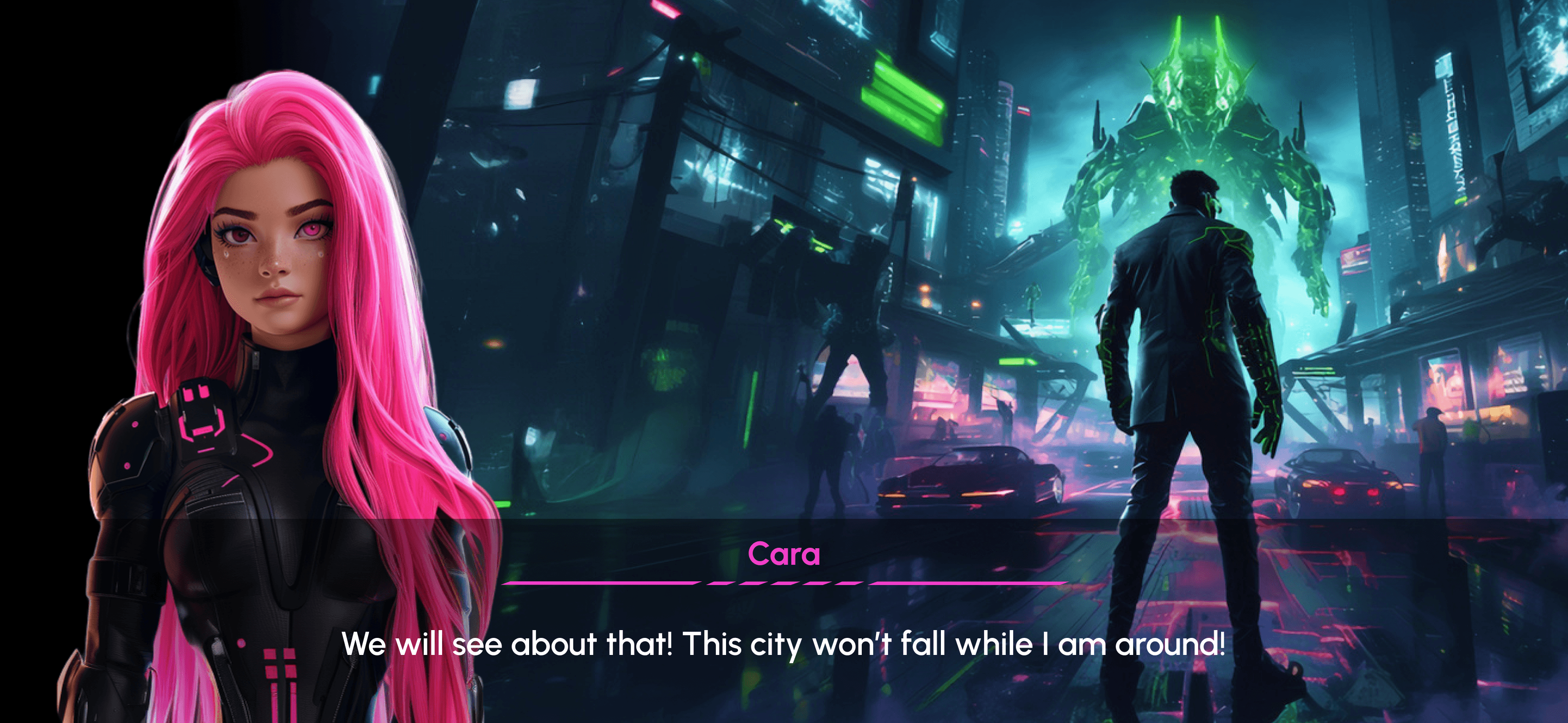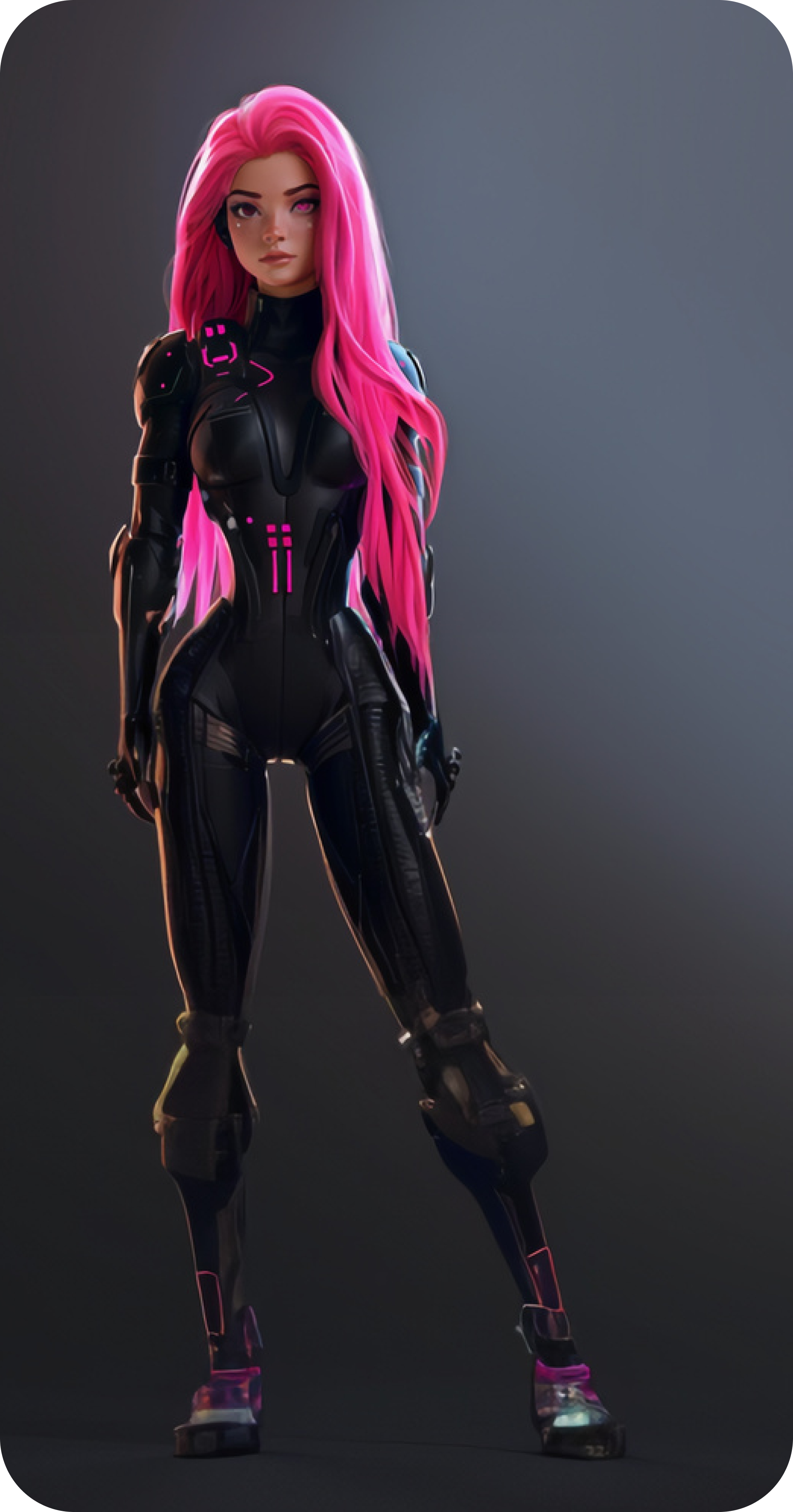 Cara is a young girl with vibrant pink hair, striking big eyes, and a cyborg form, characterised by determined personality and pure heart.